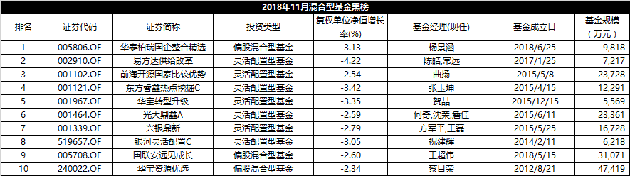 不过,并非所有偏股混合型基金都能“咸鱼翻身”。华泰柏瑞国企整合精选(005806.OF)、国联安远见成长(005708.OF)、华宝资源优选(240022.OF)便全部登上11月混合型基金黑榜。