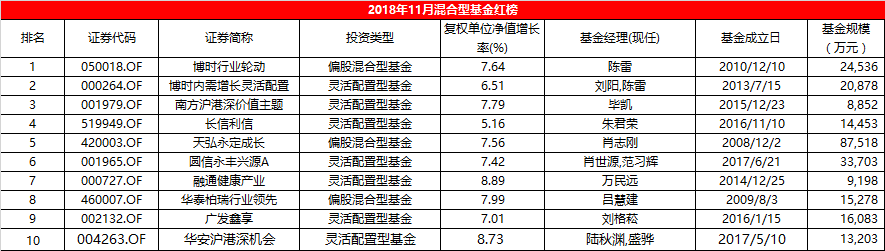 根据Wind数据统计,11月全市场存续混合型基金共有2952只,月平均收益率为1.22%。下面为综合得分最高的10只基金: