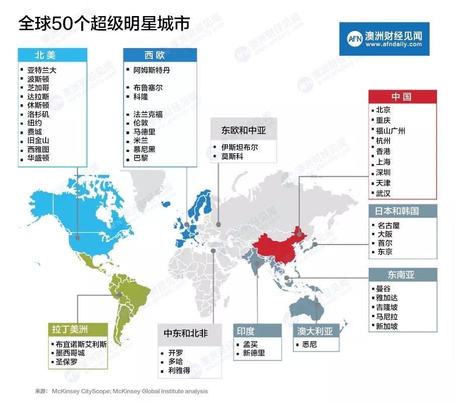 无独有偶,全球金融咨询机构麦肯锡对全球3000个人口不少于15万、GDP排名前列的城市进行了评选,最终评出出了“全球50个超级明星城市”。