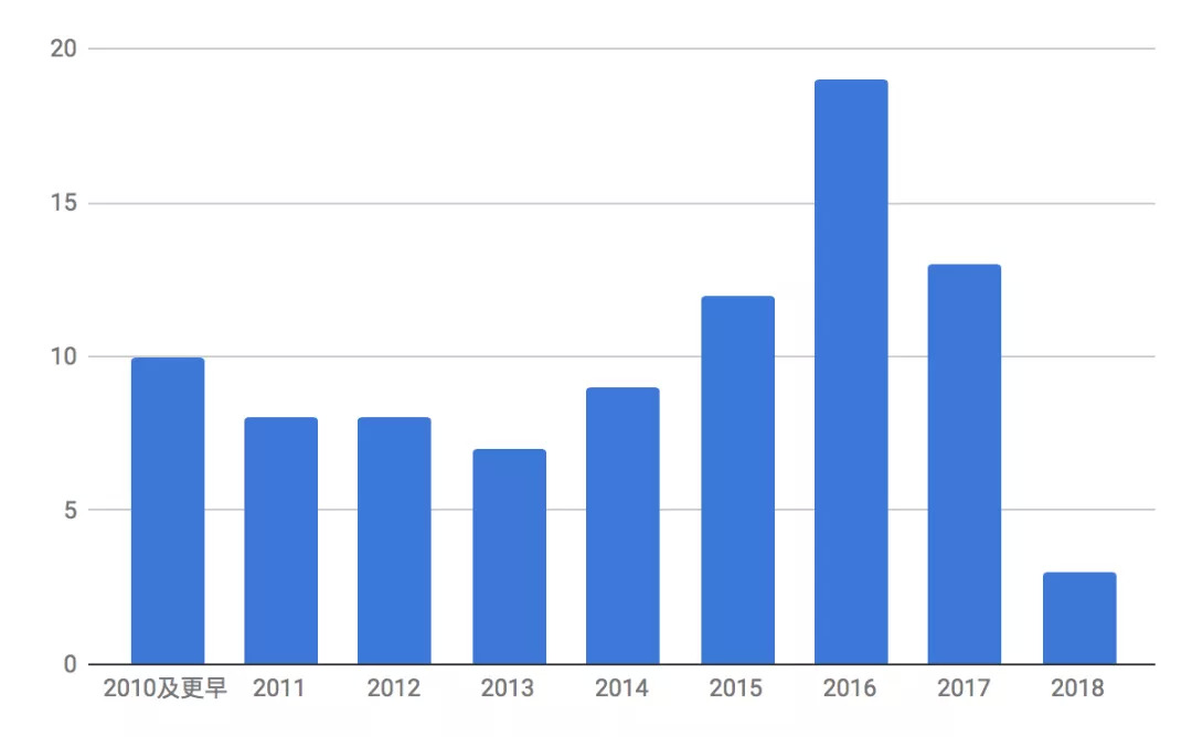 以 Crunchbase 上的数据为准,小探整理的 115 家 AI+新药研发领域的公司里,有 40% 成立于 2014 到 2017 年间。