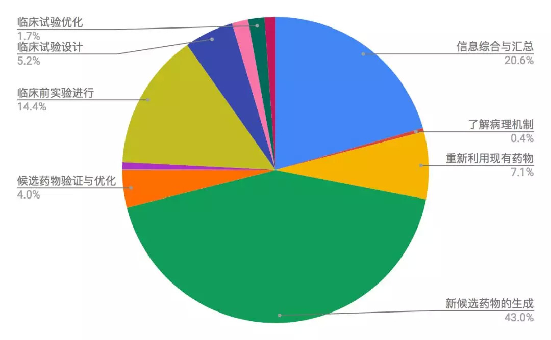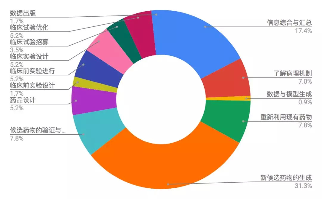其中,在 “产生新的候选药物(generate novel drug candidates)” 这个小领域的初创公司数量占比最大,115 家里足足占了 36 家: