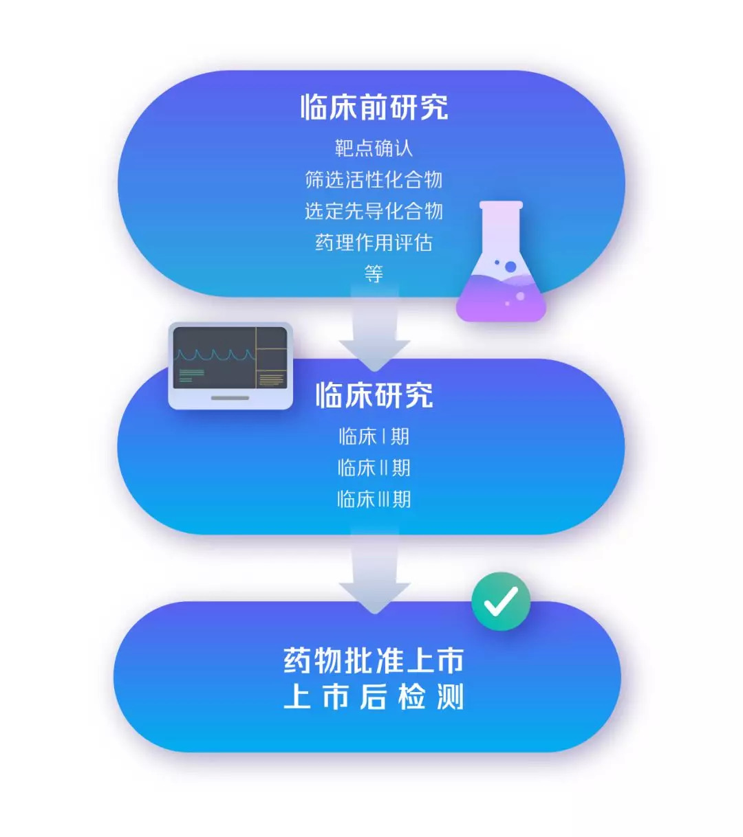 以常见的小分子化合物药(比如青霉素)为例,新药开发可以分为:临床前研究、临床研究,药物批准上市及上市后监测这三个大步骤。