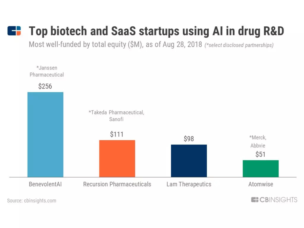 今年,BenevolentAI 获强生公司旗下 Janssen Pharmaceutical 投资,这也使得前者成为 AI+新药研发领域获得投资最多的初创公司。21 亿美元的估值,也让它顺利挤进了独角兽俱乐部。