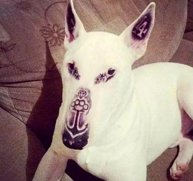 不仅是猫,巴西一名纹身师Emerson Damasceno,在自己的牛头梗耳朵眼睛鼻子附近都做了文身。