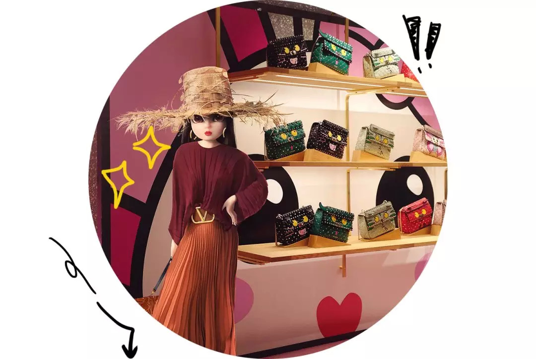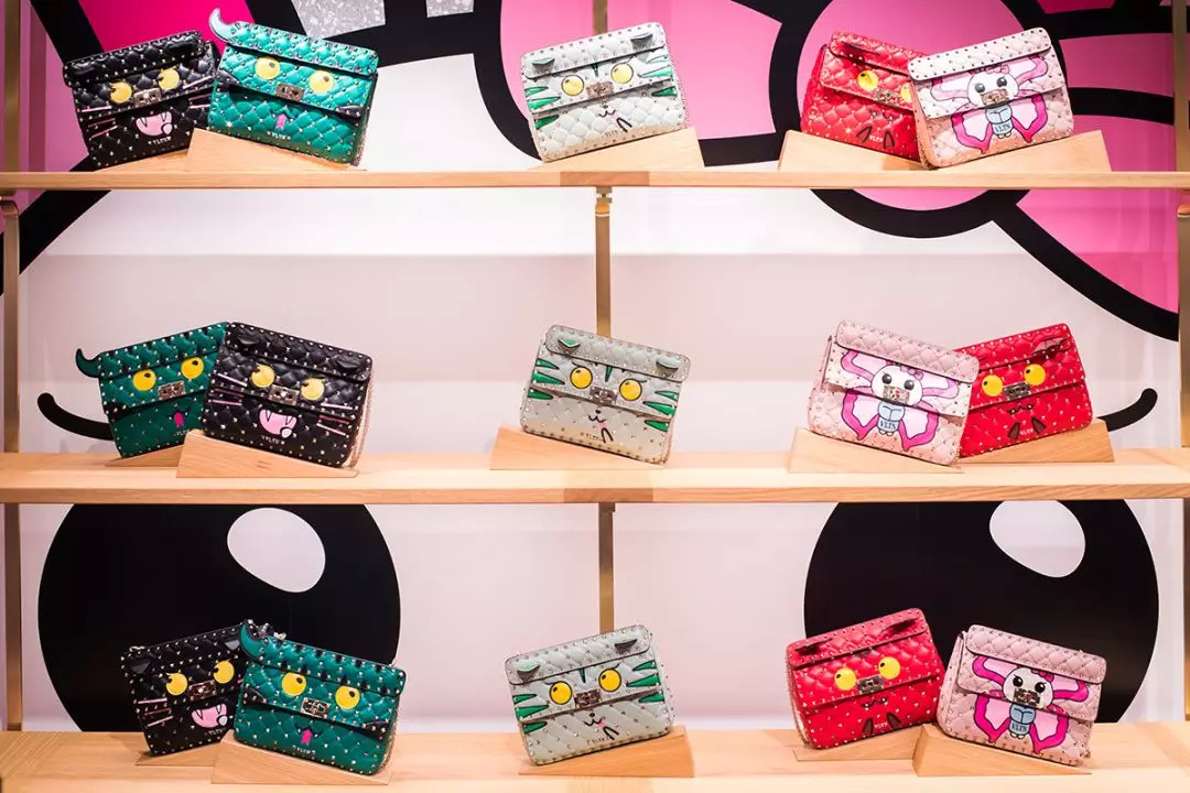 他们经典的铆钉包也有了大眼睛和小耳朵,摆了一面墙。