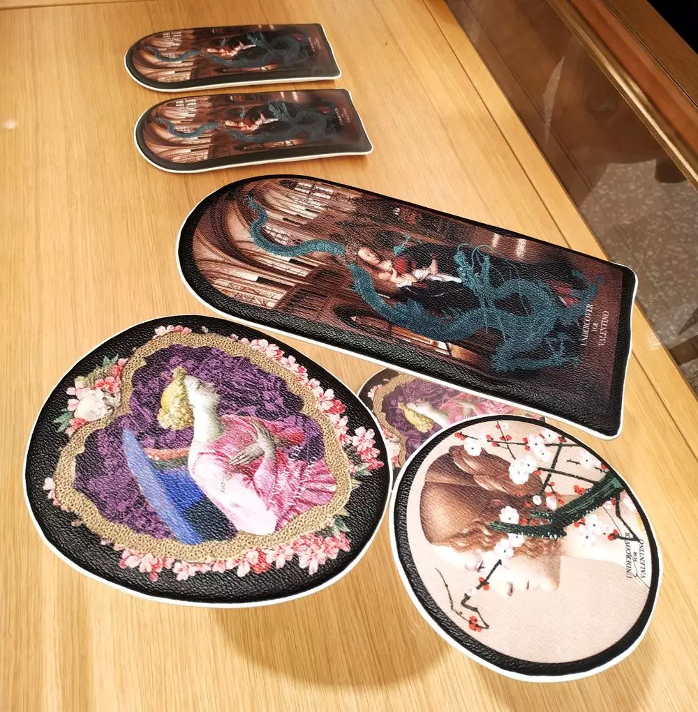 比如一进店门就能看到的UNDERCOVER合作手拿包和零钱包,上面是文艺复兴风格的图案。
