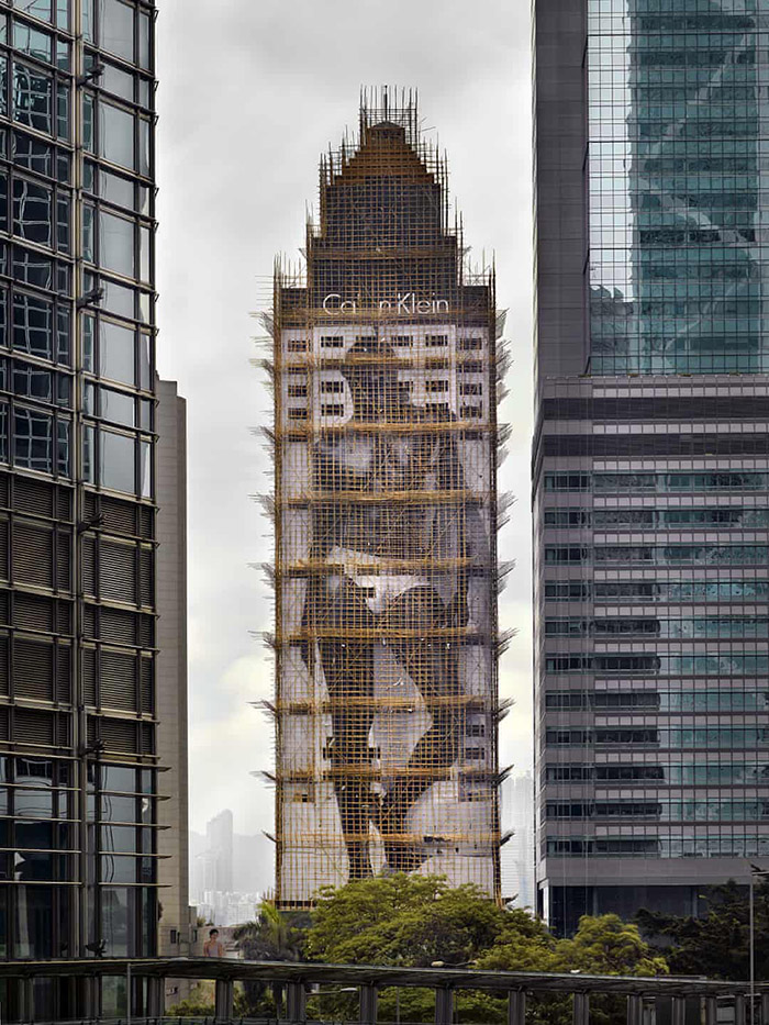 20多年来,摄影师 Peter Steinhauer 记录了香港建筑工地的竹棚架和建筑材料紧密包裹的摩天大楼。在施工过程中,这些包裹材料用以防止建筑碎片掉落到下面的街道上。Steinhauer介绍说:“一种不同颜色的彩色半透明尼龙网材料出现在正在建造或正在翻新的建筑上。一种坚固的、深绿色和不透明的材料被应用于正在拆除的建筑物。”