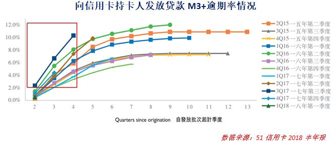 在2018年半年报中,51信用卡披露了信用卡持卡群体的贷款不良率(逾期90天以上)情况。2017年3季度向信用卡持卡人发放的贷款中,截止2018年6月末,M3+逾期率已经超过10%,且仍在上升通道中。