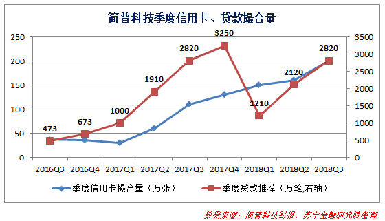从简普科技的数据看,季度贷款推荐量波动起伏,但季度信用卡撮合量一直稳步提升,单季信用卡推荐量从2017Q1的30万张增至2018Q3的200万张。从行业角度看,截止2018年3季度末,银行信用卡累计发卡量6.59亿张,环比增长2100万张,2017年以来,季度增长保持在2000万张以上。