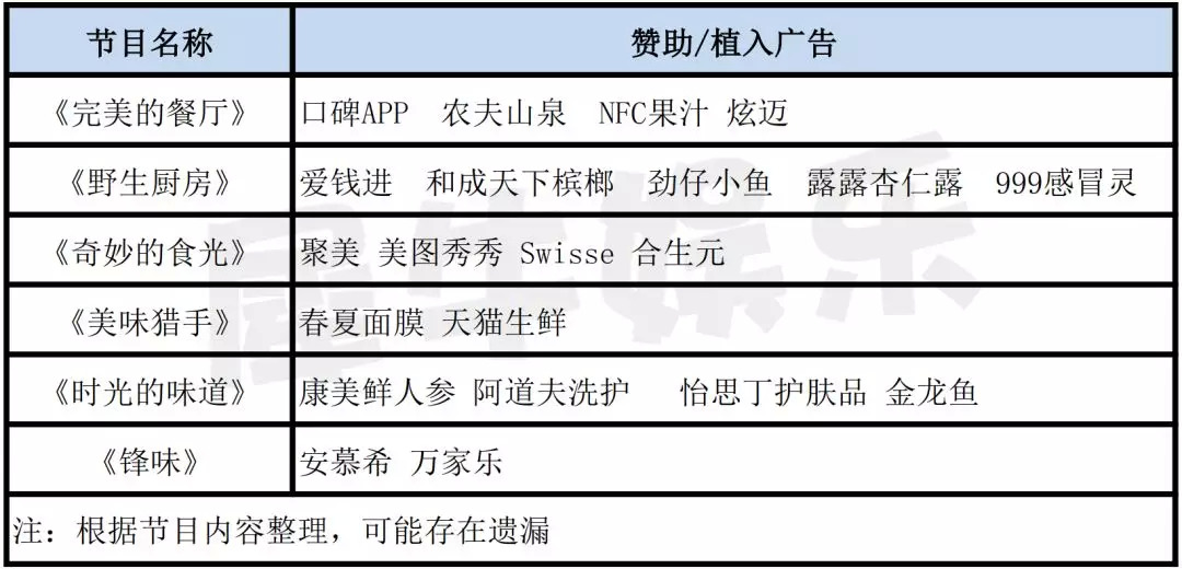 与以往的美食节目相比,这6档美食节目广告赞助与冠名商不再全是比较垂直的厨具电器、食品、饮料、调味品等,多了不少其他类别的品牌。