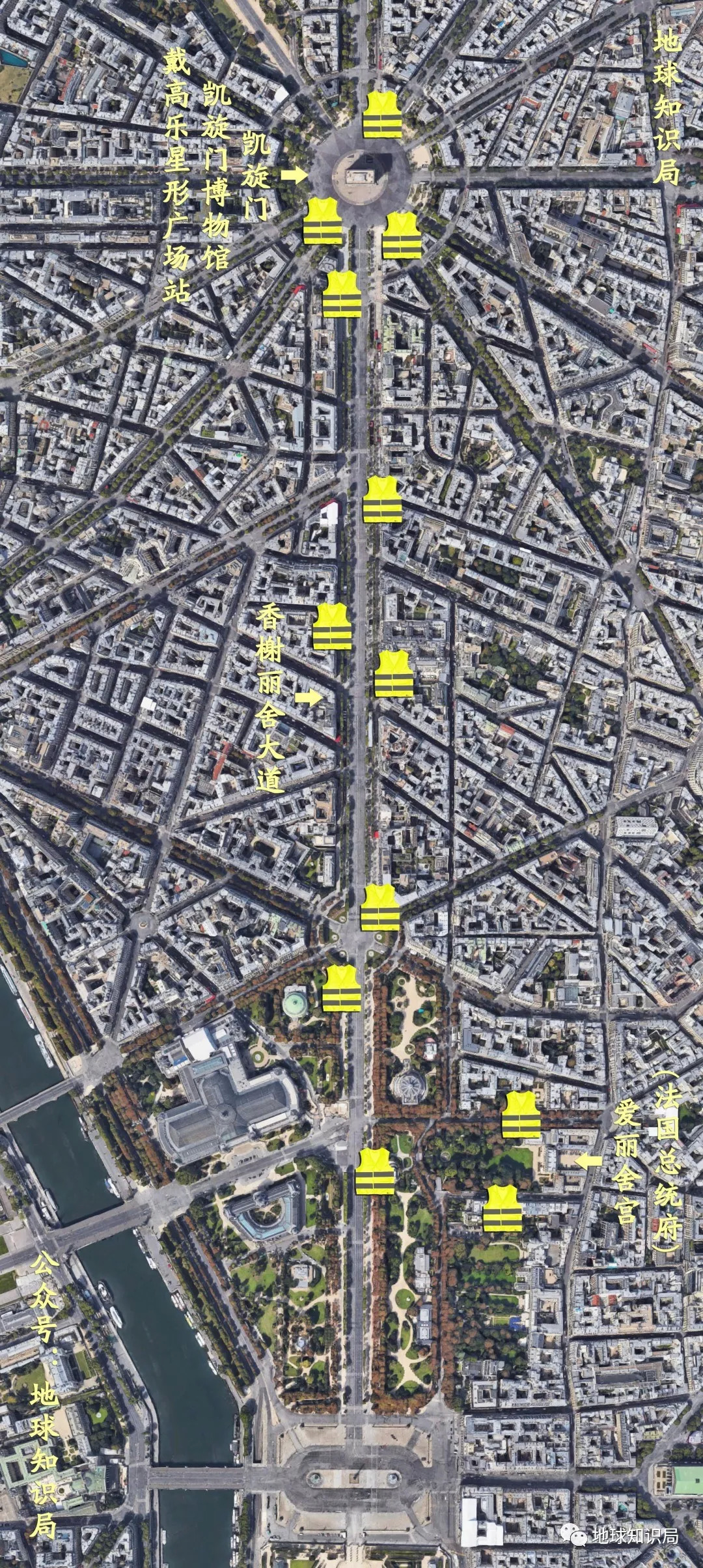 受灾建筑物都集中在相当于巴黎长安街的香榭丽舍大道周边。这里的末端——法国最重要的建筑之凯旋门和凯旋门博物馆,已经遭到了破坏。旁边的法国总统府爱丽舍宫和总理府也遭到了围攻。包括凯旋门边上的戴高乐星形广场站、巴士底站、歌剧院站等有附近有集会广场的地铁站点,也因为预防黄背心集会而关闭。