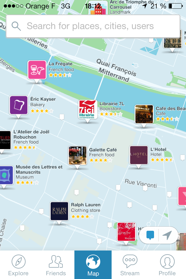 或者你可以这样想象,我和女友来到巴黎,想找一家好吃的餐馆。旅行指南通常很重;可以使用TripAdvisor,但上面的推荐者我根本不认识,他们的推荐真实吗?很有可能我们去的餐馆挤满了人,都是因为看了某条推荐;或者,我亲自问一个巴黎人,但首先我得发个邮件,得到答复后,再去找一张地图。但是如果我有一张巴黎的数字地图,并能够直接在上面找到你最喜欢的餐厅,就能省去这诸多麻烦而枯燥的步骤,省下时间喝杯咖啡!