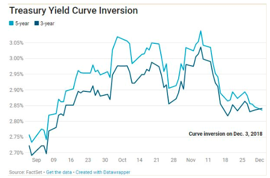 周一(12月3日),10年期美国国债收益率(2.97%)和2年期美国国债收益率(2.82%)之差大幅缩窄5个基点, 为今年3月下旬以来变动最大的一天。目前15个基点的利差,是自2007年6月上一次倒挂以来最窄的(随之而来的便是2008年金融危机)。