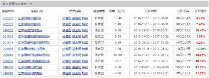 在其职业生涯的上一站——汇丰晋信基金的任职期间,曹庆共管理过4只混合型基金,6只股票型基金(按不同份额分开计算)。其中,汇丰晋信低碳先锋是曹庆管理时间最长的一只基金,任期为2013年12月至2016年4月,该基金在曹庆管理期间收益42.95%。该基金也是国内第一只低碳主题基金,从持仓来看,大禹节水、阳光能源、雪迪龙等个股曾被曹庆连续三季度重仓。