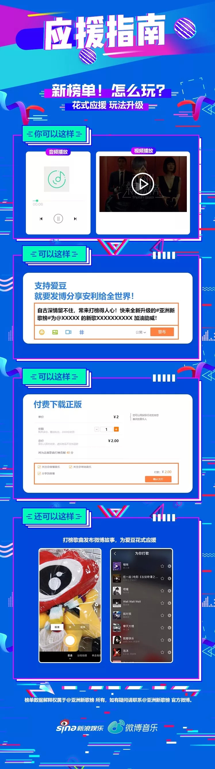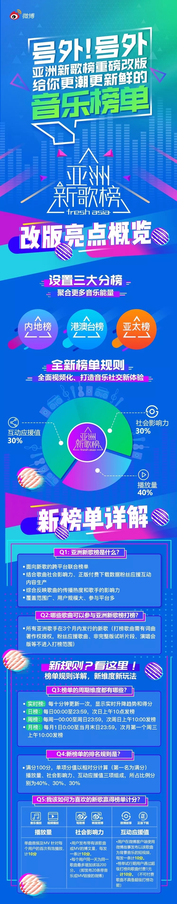 社会影响力是基于有效传播的基础上的,短视频作为当下最热门的传播介质,BGM中的音乐转化率也大大提升。围绕“短视频”+“互动应援”的核心机制,亚洲新歌榜在旧的基础上进行了改版,首先体现在计分规则上,之前亚洲新歌榜的计分规则上,更加侧重刷试听、刷转发,改版之后,从上榜原则、排名规则、计分的三个维度(播放量、社会影响力、互动应援值)进行考量,算法更侧重社会影响力和互动应援值。