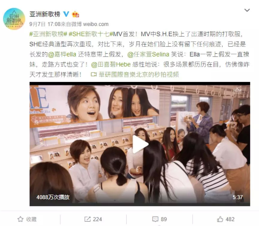 为何以微博为传播平台的亚洲新歌榜,拥有如此高维度的传播效果?首先是因为微博平台的娱乐互动性,作为国内最大的社交平台,微博在明星、音乐、粉丝之间形成了良好的沟通渠道,微博平台也成为了音乐人最为重要的音乐宣发平台之一。例如李宇春为了推广新歌回归微博发布《一趟》,72小时互动量达到326万,MV播放量达到了4093万;SHE单曲《十七》MV发布后,经过明星好友、众多KOL转发传播,播放量达到4088万。