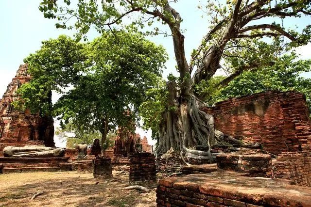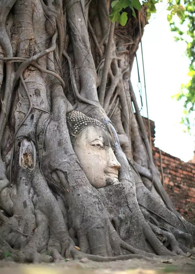 玛哈泰寺(Wat Mahathat)是大城府最古老、最中心的寺庙,拥有“菩提抱佛”的奇观——佛头与大树融为一体,让人大呼奇妙。
