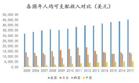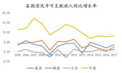 ▲最近12年中美日韩4国人均可支配收入情况▲