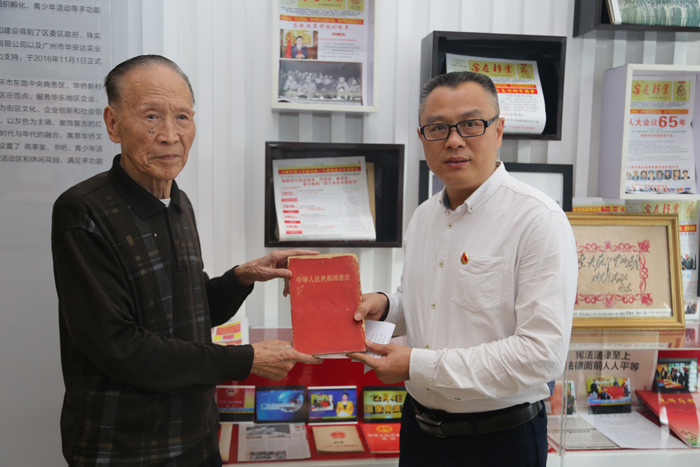 活动上,华乐街邀请了年届85岁的老党员屈干臣为广大基层干部和社区群众上了一堂有意思的宪法历史课。屈老有着丰富的公职人生,在叶剑英、梁灵光等老领导身边工作过。喜爱收藏的他在多年的机关工作中收藏了约3万件重要的历史文献资料,退休后自掏腰包建立了全国第一家个人档案馆——“屈干臣档案馆”。屈老还向大家展示了他珍藏多年的1954年全国人大常委会内部版本,并分享了当年“夺书”的惊险场景,引得全场人员的赞叹和点赞。