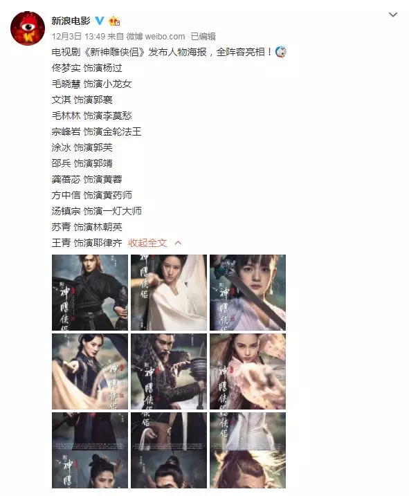 2018版《新神雕侠侣》最近释出了一组角色海报。