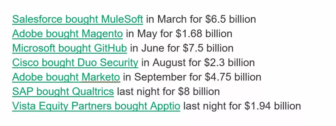 同一时间在大洋对面美国的企业软件市场并购火热,今年已发生的几起案例都是数十亿美金的大手笔。