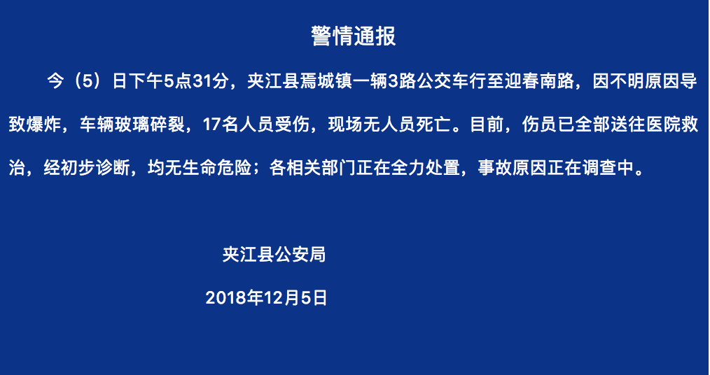 夹江县公安局微信公众号“夹江微警”发布《警情通报》:今(5)日下午5点31分,夹江县焉城镇一辆3路公交车行至迎春南路,因不明原因导致爆炸,车辆玻璃碎裂,17名人员受伤,现场无人员死亡。目前,伤员已全部送往医院救治,经初步诊断,均无生命危险;各相关部门正在全力处置,事故原因正在调查中。