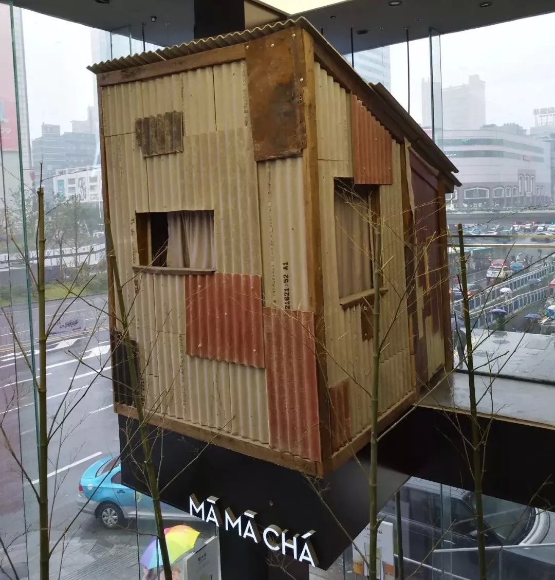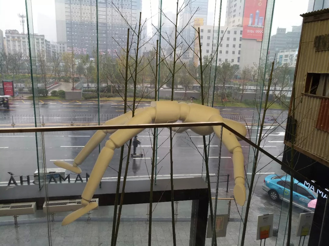 另一家门店也延续了第一家店的创意设计风,一楼依然是透明的玻璃幕墙,站在路上就能通过玻璃幕墙看到一个竹子做的人被吊在半空中,呈坠落的姿态,让路人的好奇心爆表。