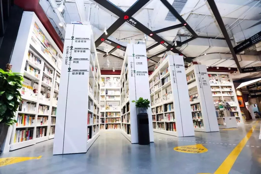 14组主题书籍都与“旅行”息息相关, 头顶设计的横梁来自于地铁的标识,黄色、蓝色、红色的线条蔓延交织。