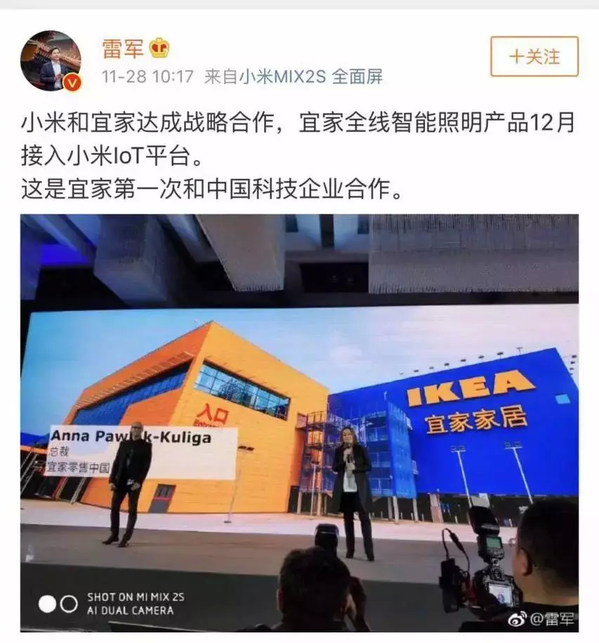 会后,小米CEO雷军还发布微博表示,这是宜家首次与中国科技企业合作,此次合作将会加速全球家居产业智能化。未来,用户在宜家购买的灯具将全面支持米家APP及小爱同学语音控制。