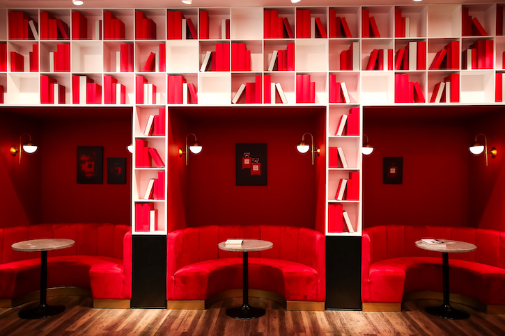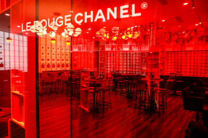 走进香奈儿红色工厂,会发现设计师已将店面化为“美丽生产间”:在漫布四周的鲜红之中,红色溶器中的唇膏正随着传送带送出“脸红心跳”的气息;抬头仰望,只见制造线正有条不紊地输送着红色五号香水;穿越氤氲着香氛与霓虹荧光的五号红廊,红色吧台已经恭候多时。身处其中,即使是最随意的转身都能在照片上释出电影质感,随手一拍即是大片。