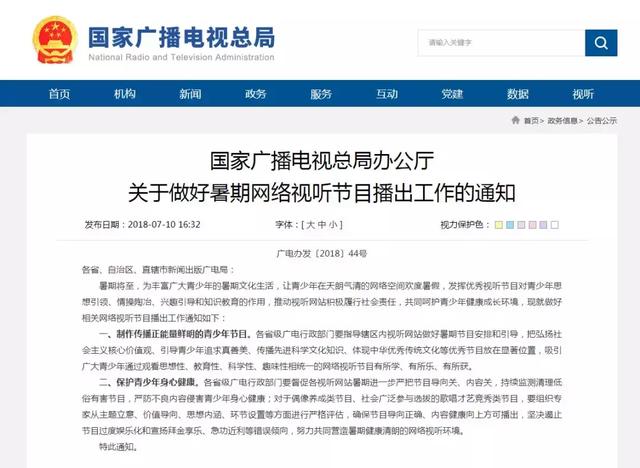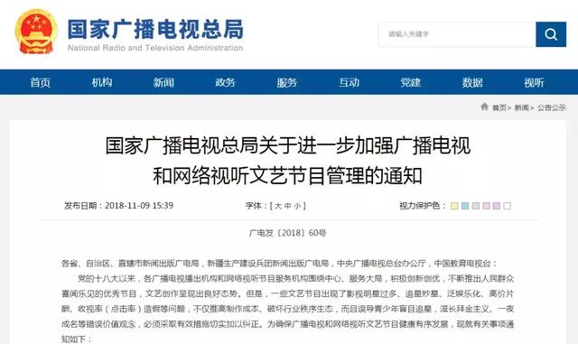 首先,对于偶像养成类节目,今年上半年虽迎来了《偶像练习生》《创造101》两档选秀节目的火爆,但广电总局在随后的多次通知中都有提及此类节目。一次是在暑期档《关于做好暑期网络视听节目播出工作的通知》中明确指出:“对于偶像养成类节目、社会广泛参与选拔的歌唱才艺竞秀类节目,要坚决遏止节目过度娱乐化和宣扬拜金享乐、急功近利等错误倾向。”另一次是在《关于进一步加强广播电视和网络视听文艺节目管理的通知》中要求:“坚决遏制追星炒星、泛娱乐化等不良倾向,严格控制偶像养成类节目。”