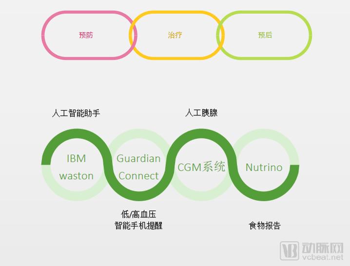 在人们的印象中,美敦力是医疗器械的专业大玩家。但从下图中我们却可以发现,美敦力完成了在糖尿病领域的全面布局,在预防、治疗、预后等各个环节,都有相应的产品。