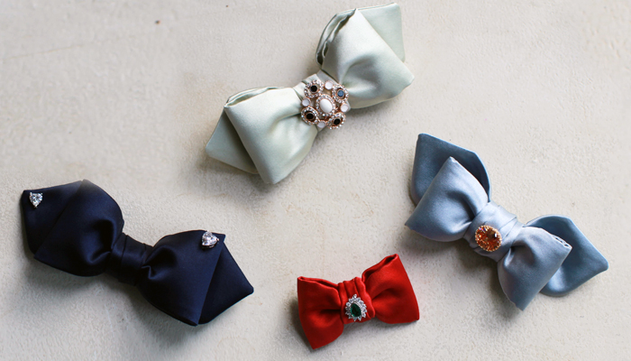 134 RDC一年出两季新品,当中还会穿插一些特别的mini系列,以及并不放在线上店出售的限量款——由领结脱胎而来的胸针系列,这是Aki用产自法国的高定面料做成小小的领结造型的胸针,表面装饰有高级水晶和金属,“越小越难做,这要求在更少的面料上做更精细的手工缝制,因此价格也更为昂贵。”而134 RDC提供的领结定制服务则接受现有面料和所有样式的任意组合。