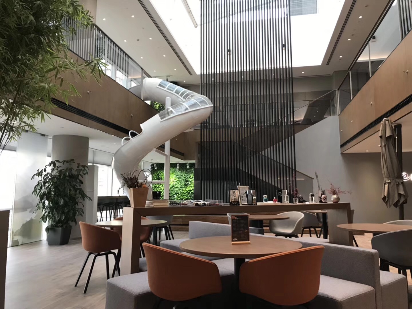 简约的圆桌、布料沙发、用植物和香水瓶分隔开来的交谈空间以及由回旋滑梯和竖直框架结构构成的立体空间流露出了浓浓的德国“包豪斯”风味。