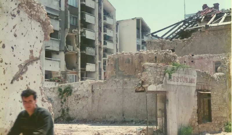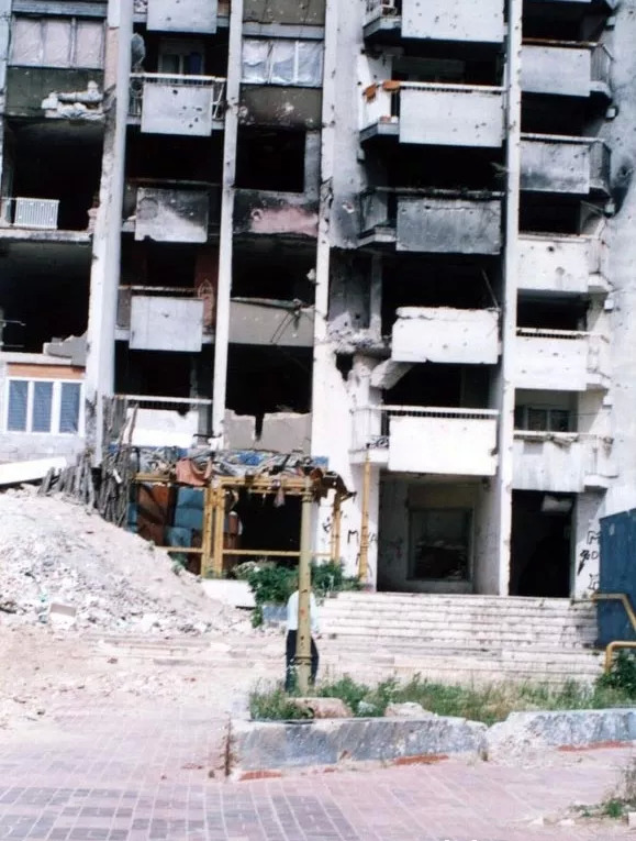 游客到莫斯塔尔都是为了去看UNESCO世界遗产——老桥,却不知道“老”的桥已经被摧毁了。当丁海笑再次路过文化宫式的巨型建筑,却发现那是一座千疮百孔的百货公司废墟,后来他才知道,他住的地方其实是隔壁的一栋被战争损毁更严重的危楼,照片看上去像地震遗址,他们进行了加固。丁海笑住在六楼,房间的阳台是图上较窄的那一列,当然修修补补后看上去已不是照片上的模样了。最开始他发现那里诡异是因为电梯老停不到位,有次他按错了楼层,开门后是被混凝土封死的出口,然后有一分钟电梯都没任何反应。住了两天后他问房东,这里也被毁坏过吗,房东给他传了两张照片,那是他住的公寓在1994年的样子。