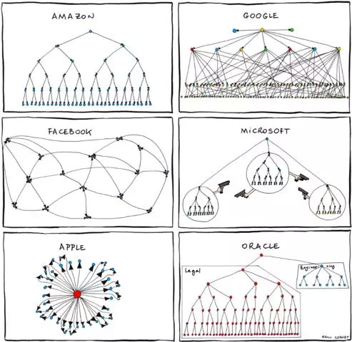 在这幅漫画中,微软的组织结构被描述为“三足鼎立”,互相捅刀。虽然有CEO高高在上,但是内部已经乱作一团。