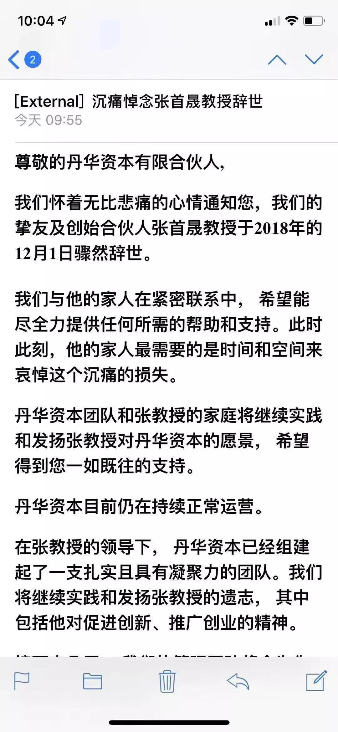 一代巨星陨落,张首晟家人、丹华资本员工及外界都沉浸在巨大的悲痛之中。丹华资本在发出的邮件中表示:“我们与他的家人在紧密联系中,希望能尽力提供任何所需的帮助和支持”,“丹华资本目前仍在持续正常运营。在张教授带领下,丹华资本已组建起了一支扎实且具有凝聚力的团队。我们将继续实践和发扬张教授的遗志,其中包括他对促进创新、推广创新的精神”。