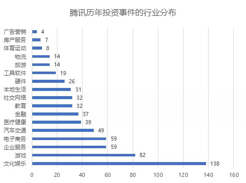 从行业分布来看,腾讯所布局的赛道非常丰富,共涉及 15 个行业。其中,文化娱乐、电子商务和企业服务是腾讯着重布局的赛道,三大赛道投资事件占比达 55.28%。其中,腾讯今年在文化娱乐领域已经出手 40 次,出手频次远超其他赛道;此外,文化娱乐领域的投资事件数量连续四年排名第一位,足以看出腾讯对这一领域的重视。
