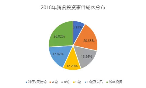 从腾讯在 2018 年的投资轮次来看,中后期的项目是腾讯布局的重点,占比约为 43.09%。其中,战略投资的占比在所有轮次中是最高的,占比超过 1/4(约为 26.02%);早期投资(种子/天使轮、A 轮)占比 28.46%,中期投资(B、C 轮)占比 28.46%。
