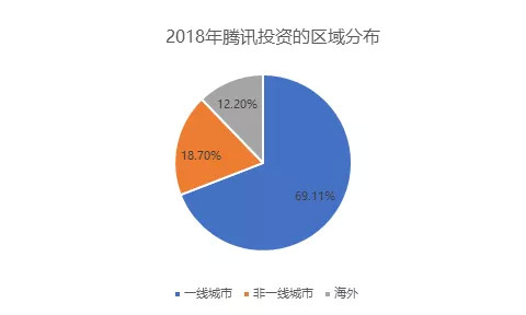 从腾讯在 2018 年的投资区域分布来看,一线城市(北京、上海、深圳、广州)占比接近七成,非一线城市占比不足两成。与阿里、百度相比,腾讯海外市场的投资占比略低,前两者海外投资占比分别为 18% 和 19%。