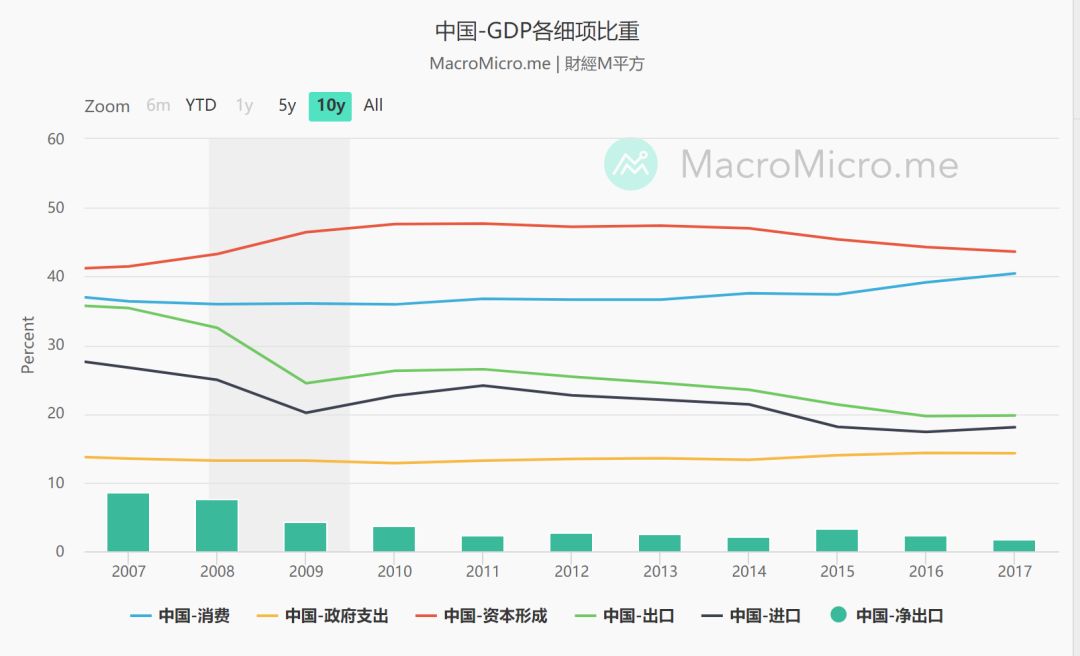 我们来看一个有趣的数据,根据财经M平方,中国在过去的十年,在国家GDP的各项占比中,消费一直保持 40% 左右的占比。