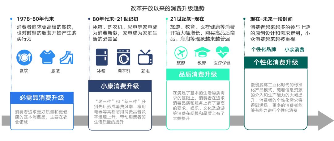 据TalkingData发布的《2017新消费报告》,1.0时代为必需品消费升级、2.0时代是小康消费升级、3.0 则出现了品质化消费升级,到不久的将来,是个性化消费升级。