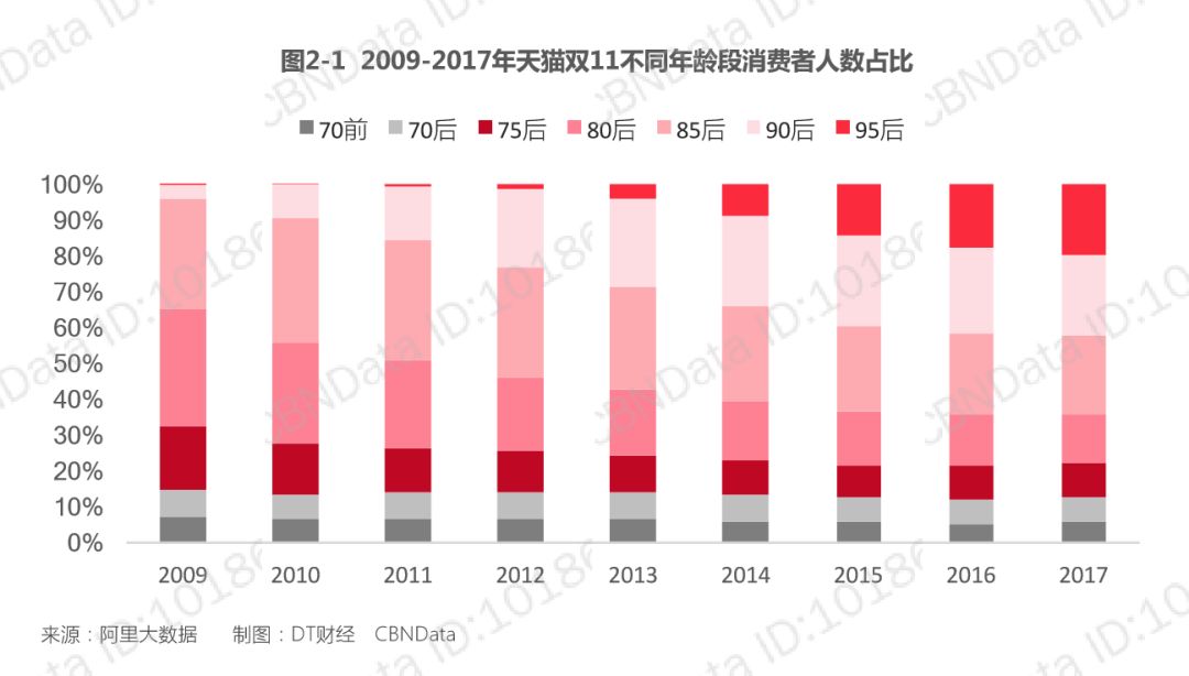 在今年双十一之前,天猫与CBNdata推出的《新消费时代到来》报告中,便对天猫上的消费人群进行了分级。以下柱状图表明,已成熟的80、90后群体占了总人数的 60%以上,它们是当下消费主力军。95后消费占比在2017年已接近 20%,这部分代表着接下来的消费观,也是品牌当下的重点研究对象。