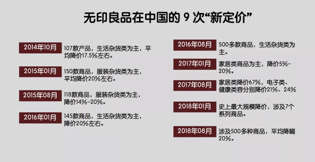 而在中国,它却选择了去讲一个更具有品质感的故事去提升其溢价。今天,无印良品已做了四年来的第九次降价。