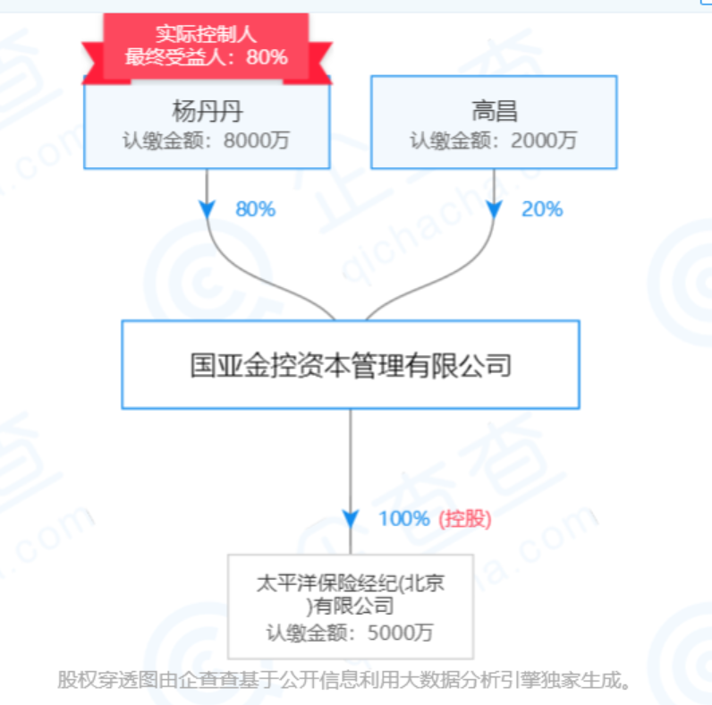 另一个国亚金控,则成立于2016年8月30日,注册资本1亿元,同样属于租赁和商务服务业,旗下有太平洋保险经纪(北京)有限公司。