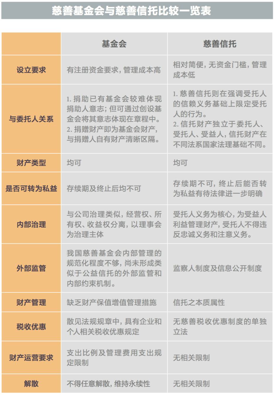 但是,2016年《慈善法》颁布实施以来,一系列慈善信托的政策准备日臻完善,慈善信托以其更多优越于慈善基金会的特质,有望成为新时代慈善事业新的助推器。本文在现有法律框架下,拟从设立要求、与委托人关系等十个制度方面对两者进行比较分析。