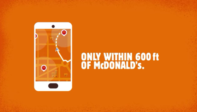 人人都知道购买皇堡的地方是汉堡王,但如果你想在美国用1美分的价格购买,官方会推荐你去麦当劳——从12月4号到12号期间,只要在全美14000家麦当劳餐厅600英尺的范围内,用汉堡王app订购皇堡,再到附近的汉堡王去取,只需要1美分。