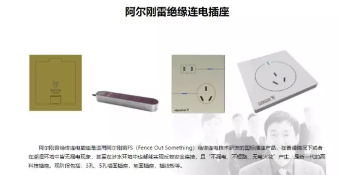 在阿尔刚雷的官网上,介绍其产品包括3孔和5孔墙面插座、地面插座和插线板三类。在今年7月28日《成都商报》的一则报道中又写道,阿尔刚雷在此日首发了全球第一款“不怕水”绝缘连电厨卫专业插座。