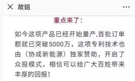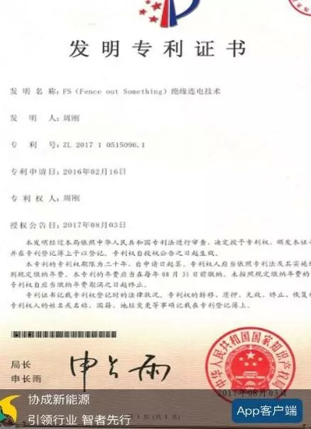 在故姐的文章中表示,这项专利技术已由“协成新能源”独家赞助,开启了众投模式。铅笔道记者在各种手机应用市场中搜索,并未找到此款APP,只能在百度中能搜索到一个协成新能源的理财介绍网页。点进去之后,首页就显示了FS(fence out something)绝缘连电技术的发明专利书,书中显示发明人为周刚。但是铅笔道记者就该专利号在国家知识产权局检索,发现专利号错误,没有搜索结果。