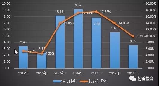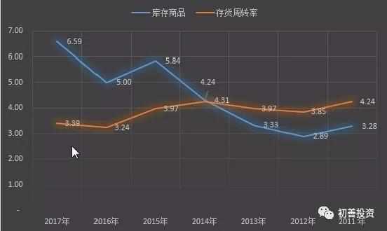 我们看存货里的库存商品金额,从2011年至2017年,库存商品金额从3.28亿增长至6.59亿元,接近翻倍。从存货周转率来看,稳中有降,近两年基本维持在3.39.